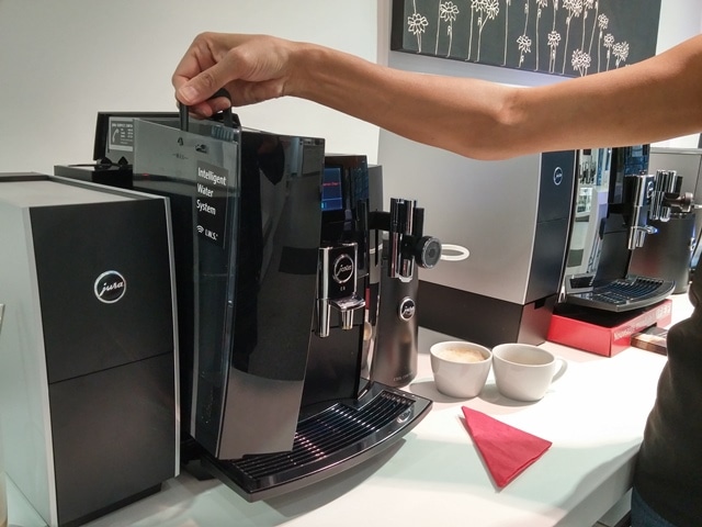 Essayer une machine ultra-automatisée de Jura est une excellente façon de s’initier à l’art de l’expresso.  L’engouement pour les cafetières à capsule a démocratisé la préparation de café de spécialités à la maison.  Contrairement aux populaires cafetières à capsule de type « Nespresso », les machines Jura sont munies d’un moulin à café, offrant milles et une possibilité pour le choix du café en grains. Le moulin à café optimise la mouture selon la taille des grains; le café est toujours fraîchement moulu et fraîchement extrait.  De plus, l’avantage d’utiliser des grains entiers de café sur l’environnement est indéniable, malgré le recyclage possible des capsules.  Une cafetière de type Nespresso génère 10 fois plus de déchet qu’un modèle avec moulin à grains, dont les résidus passent directement au compost.